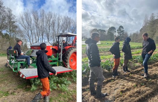 Looking ahead to the spring, we are preparing for our next crop, which will be a tomato crop grown for Heinz-Watties. We are exploring how we can minimise soil disturbance before transplanting tomato seedlings in the Regenerative treatment. One option we have is to use the MulchTec planter which transplants seedlings directly into mulch, which could be applied mulch (e.g., silage) or into a mulched cover crop. As part of this preparation, Caleb Burberry (Heinz-Watties), Phil Schofield (Hawke’s Bay Future Farming Trust) and Alex Dickson (LandWISE) visited Tobias Euerl and Robert Hall from live2give in Palmerston North to see their MulchTec planter in action.