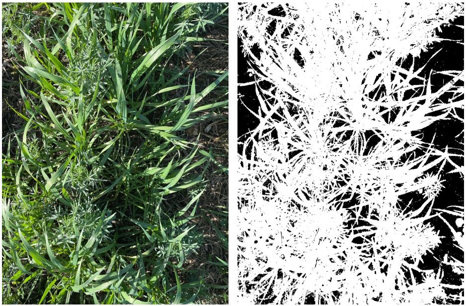 We have been regularly monitoring canopy cover using the Canopeo app. The app captures an image of an area of crop, green elements appear as white pixels and all other elements appear as black pixels, and an estimate of canopy cover is given as a percentage. The example given is from the Regenerative treatment which has oats, vetch and lupins. Canopeo estimates canopy cover is approximately 72%.