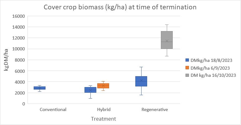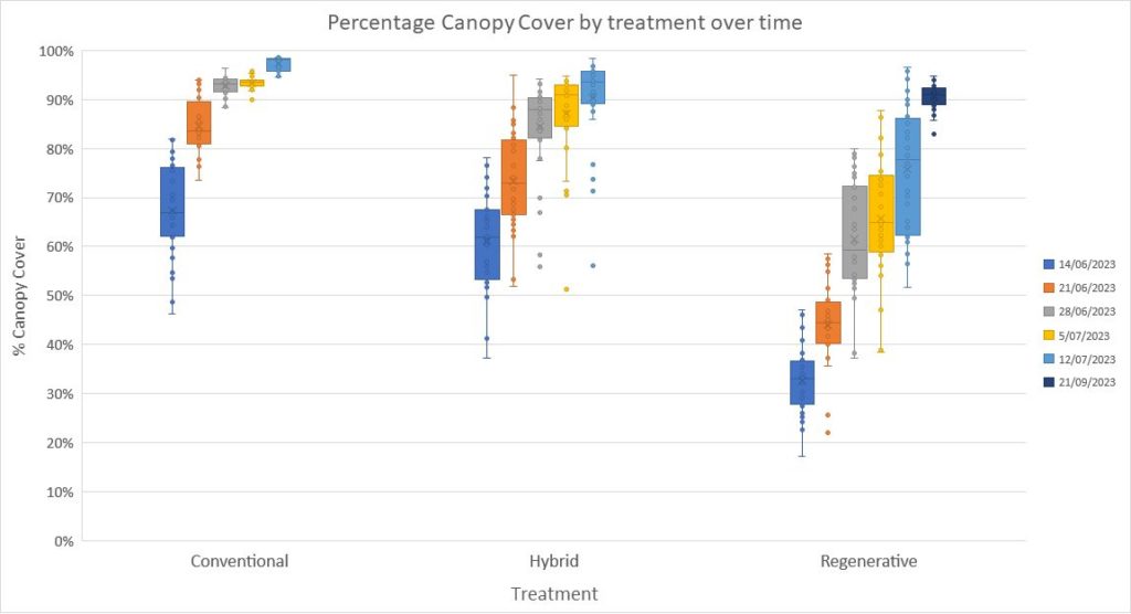 As seen in the boxplot chart above, the canopy cover (percentage of the ground covered by the cover crops in each treatment) varied with the conventional annual ryegrass planted into cultivated soil getting most cover earliest, and the regenerative oats/vetch and lupin mix direct-drilled into uncultivated soil starting slowest. The regen cover crop mix still had gaps even at the end of September, by which time the ryegrass had been terminated in the hybrid plots and grazed in the conventional ones.