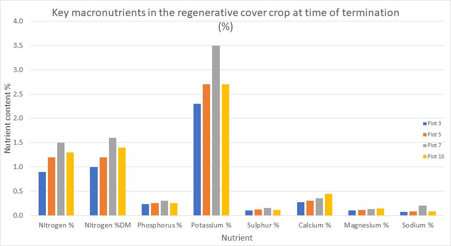 When the regenerative treatment cover crop was terminated, samples were sent to Hill Laboratories for testing. The levels of key macronutrients are shown in the chart below.