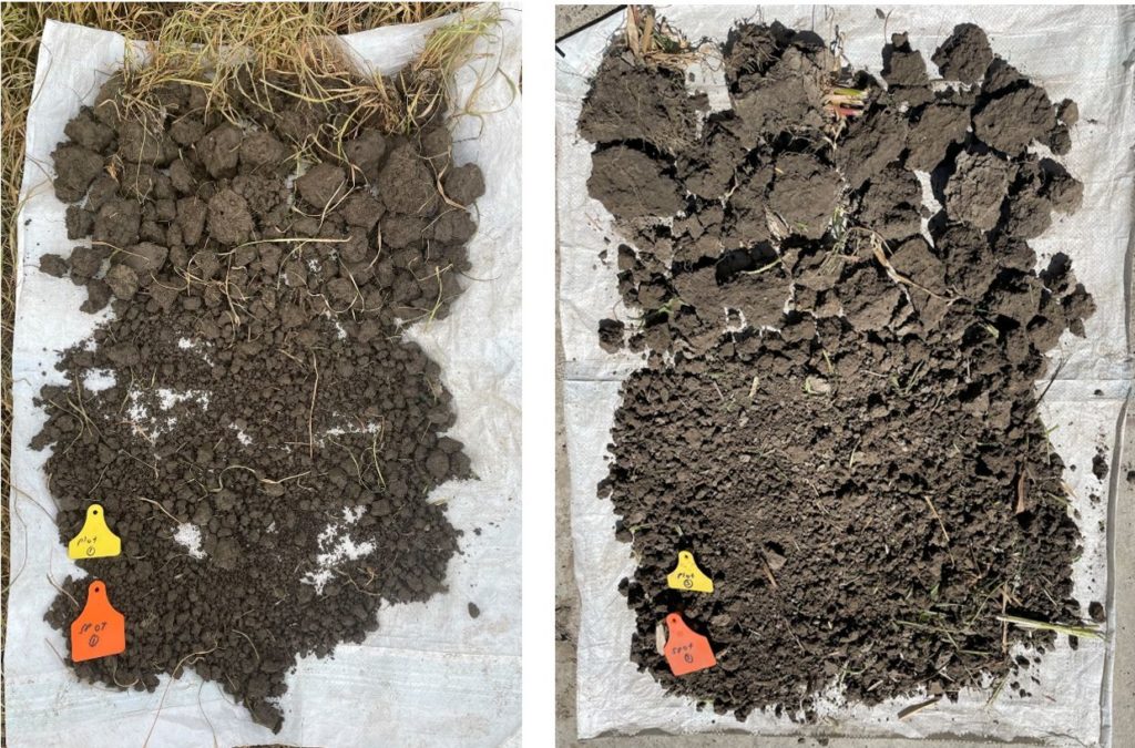 Visual Soil Assessment (VSA) was delayed due to high soil moisture conditions, but was completed over several days before groundwork commenced. Most VSAs were done in the plots, but some samples were dug out to ensure soil wasn’t disturbed by cultivation activities, and the assessments done in the shed.