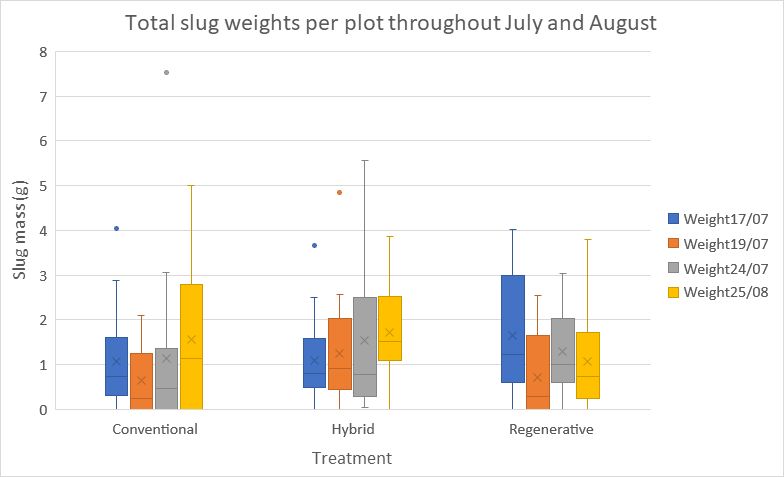Slug pressure was measured using the Oregon State University ‘Relative Slug Activity’ method. Four flowerpot bases were placed in each plot along the existing transect. Lids were left for several days. Slugs on each lid, and in the plant matter under each lid, were counted and weighed. This measure does not give ‘total number of slugs per hectare’, but it does provide a relative measure of slug pressure. The number of slugs per lid varied from 0 – 10, and the total weight varied from 0 – 7.5 g/lid.