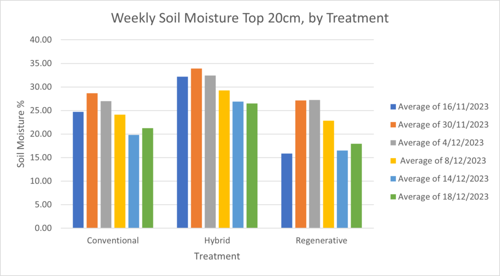 Irrigation has started with a 15mm application on 16 December that, after the heat and evapotranspiration over the weekend, barely changed soil moisture in the top 200mm where most of our root activity is currently. A second 15mm application was made immediately after the first, and a third is due.
