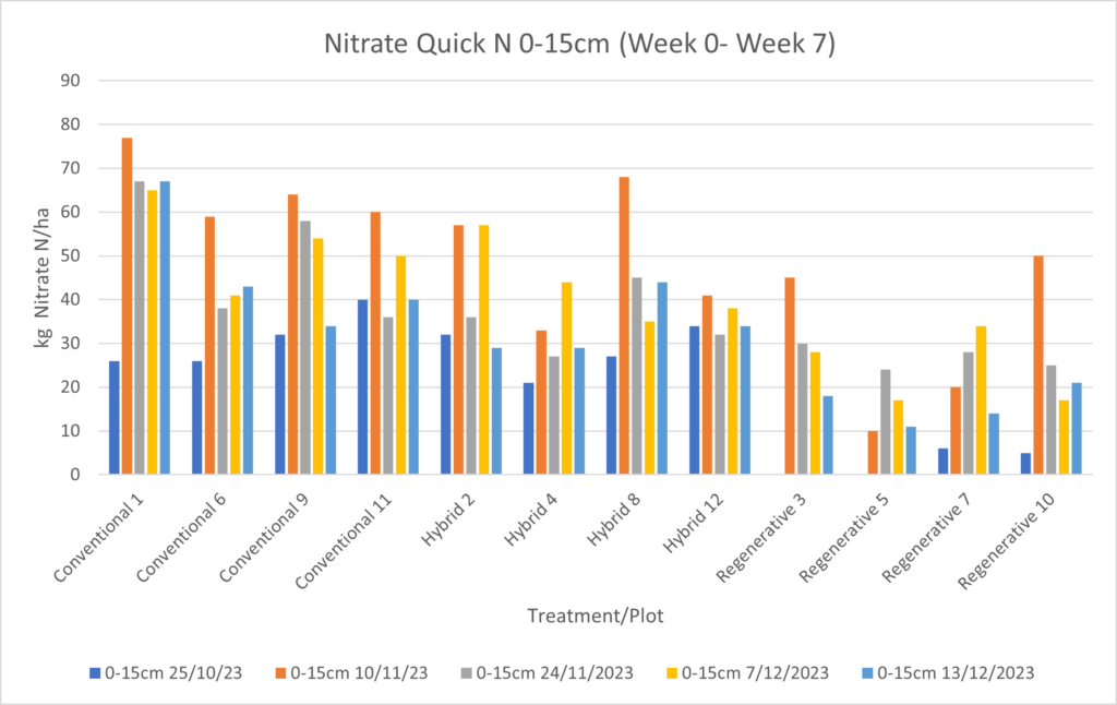 Fertiliser decisions are made by the operations group, along with Mark Redshaw from Yara. A high rate of YaraMila Complex (full N, P, K, S, Mg, B, Fe, Mn, Zn) was applied to the Conventional treatment, with a slightly lower rate of Complex applied to the Hybrid treatment. As the background fertility of the plots is in theory high enough to support a crop of tomatoes, it was decided that the Regen treatment would have an application of nitrogen only, so had YaraLiva Nitrabor applied (N, Ca, B). We have been monitoring Nitrate-N levels using the Nitrate Quick Test every two weeks. Results for the top 15cm is displayed below.