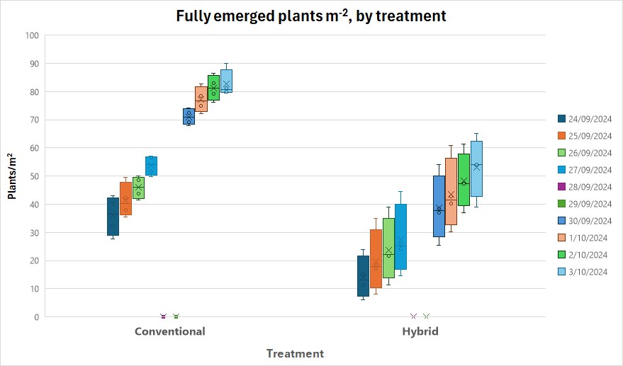 Plant emergence has been monitored since the 24th of September. Four x 1m2 quadrats are counted in each plot, each day to monitor the rate of emergence. Plants are counted when the first leaves have unfurled/flattened. The Conventional treatment population is higher and more uniform than the Hybrid, which has been slower to emerge. This is likely to be related to lower soil temperature and soil conditions at planting.