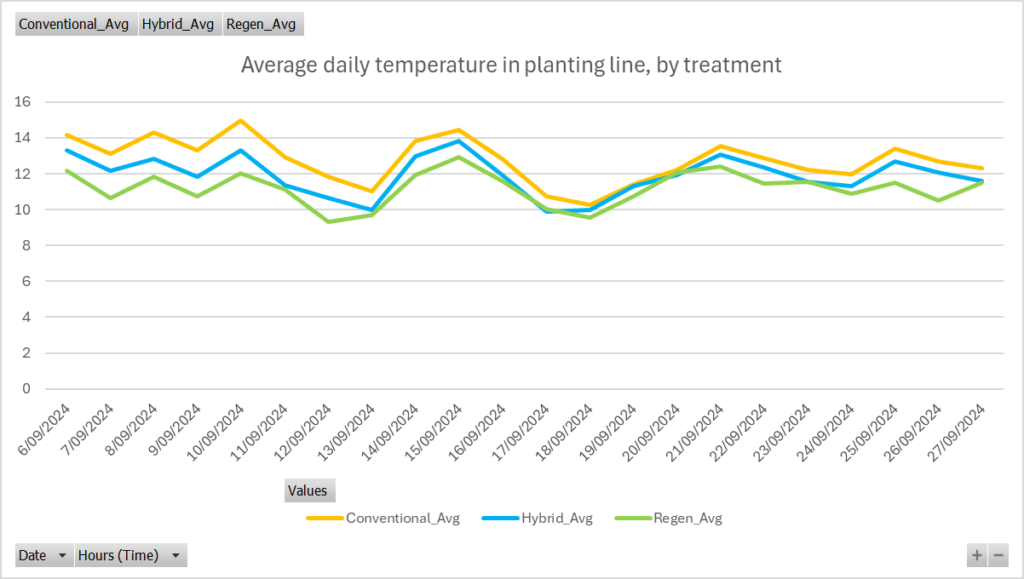 Soil temperature in the planting line was recorded every 15 minutes for three weeks from planting. using iButton microloggers. Soil temperature in the Conventional treatment (cultivated/bare soil) was consistently higher than the Hybrid (direct drilled/mulched).