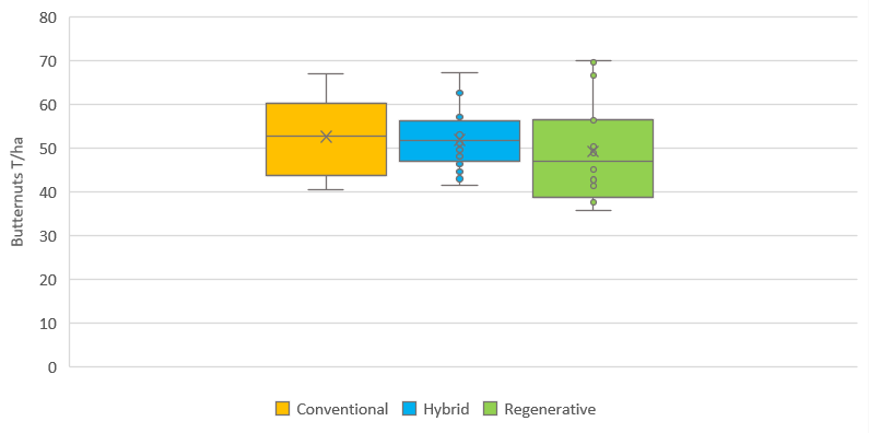 The Conventional treatment yielded 52.74 T/ha, the Hybrid treatment yielded 52.00 T/ha, and the regenerative treatment yielded 49.44 T/ha. While these yields look slightly different, there is no significant difference in yield between the treatments (P>0.05). Our highest and lowest yielding sub-plots were both in the regenerative treatment!