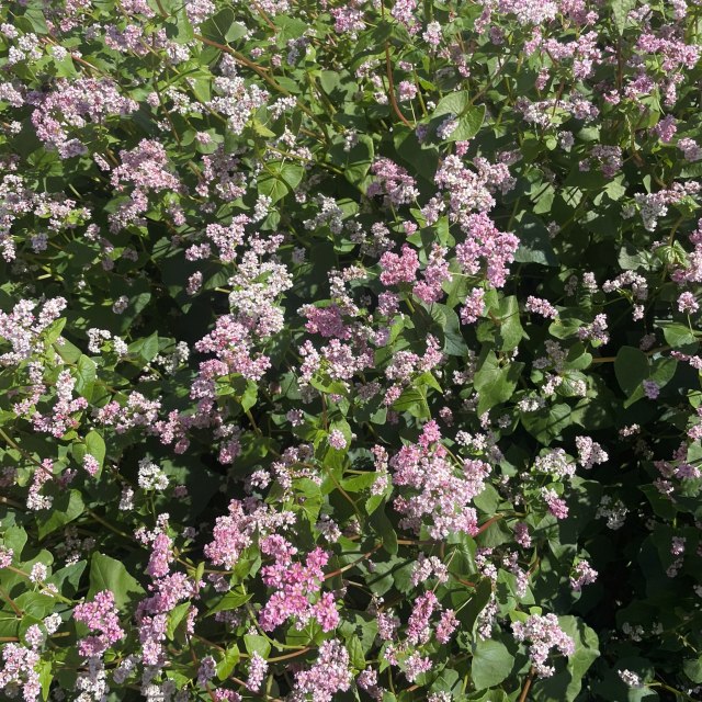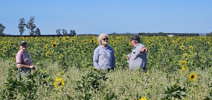 Sunflowers and buckwheat in the fenceline biodiversity strip alongside the butternuts.