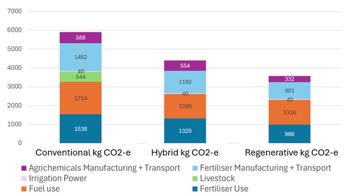 Over 2022-2025, the first 3 years of the Carbon Positive trial, the Conventional treatment had the highest emissions (5,906 kg CO2-e). The Hybrid treatment (4,401kg CO2-e) was next, and the Regenerative treatment (3,575 kg CO2-e) was lowest. Nitrogen fertiliser followed by fuel were the highest emission sources in all treatments.