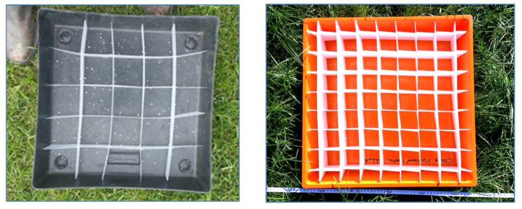 Tray design is critical for useful information to be obtained. Standard fertiliser test trays are recommended. These are typically 500mm x 500mm square (0.25m2). They will have internal baffles to stop fertiliser pellets or granules bouncing out. There is some question still about the collection efficiency of these baffled trays. Deeper trays with sunken baffles may capture more than shallower trays with flush baffles. We believe the relative catch efficiency is similar in the trays regardless of their position, but do not rely only on tray catch measurements to calculate the actual application rate (see the previous section).