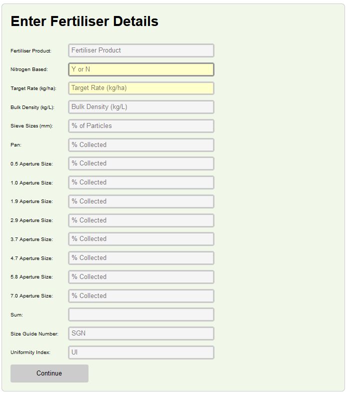 In the Fertiliser Details screen, enter the fertiliser being used. This is imprtant as different products will perform deifferently in a machine.