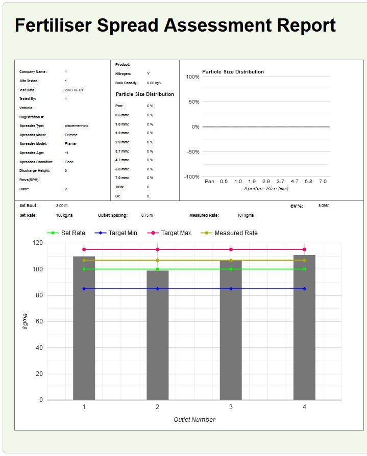 Calibrating a placement machine flows a parallel process to broadcast equipment. However, because the fertiliser is discharged directly to the ground, it can be measured directly at the outlets. Because all the fertiliser can be caught, the application rate calculations will be accurate. The uniformity still compares how evenly the fertiliser is distributed among the outlets.