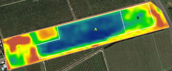 Figure 2 is a satellite image of the MicroFarm downloaded from datafarming.com.au. The area inside the white polygon, which matches the EM map above, is a barley crop. The NDVI image indicates area B is less vigorous than area A. This suggests two separate soil tests, one from each of areas A and B, could provide useful information.