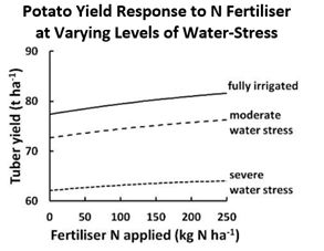 Nutrient deficiencies in the crop can occur for a number of reasons and adding more of nutrient(s) via fertiliser application may not fix the underlying problem. It may not always be an essential nutrient/s that are limiting crop growth and yield. There are other factors such as pH, soil compaction and drainage that must be kept in mind. For example, the graph in Figure 3 stresses that applying more and more Nitrogen will not compensate for water-stress. Or if it is too cold, the plant won’t grow regardless of nutrient status.