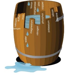 Understanding what is limiting crop growth, and therefore yield, is important. “Liebig’s Law of the Minimum” states that yield is affected by the most limiting essential nutrient. This is often shown as a barrel with shorter staves as in Figure 2. The maximum allowed by the shortest stave (in this case water) sets the maximum that can be achieved. Adding more nitrogen will not increase yield.