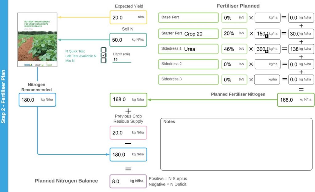 Nitrogen is one of the most highly mobile and form changing nutrients. It changes from organic matter or urea through various stages to ammonia and nitrate which is available for plant uptake. In this example, we focus on the nitrate that will be available for your crop. Remember, the input information starts with a fertiliser report and the Nutrient Management for Vegetable Crops in New Zealand guidelines. Put it together on our template that you can download here.
